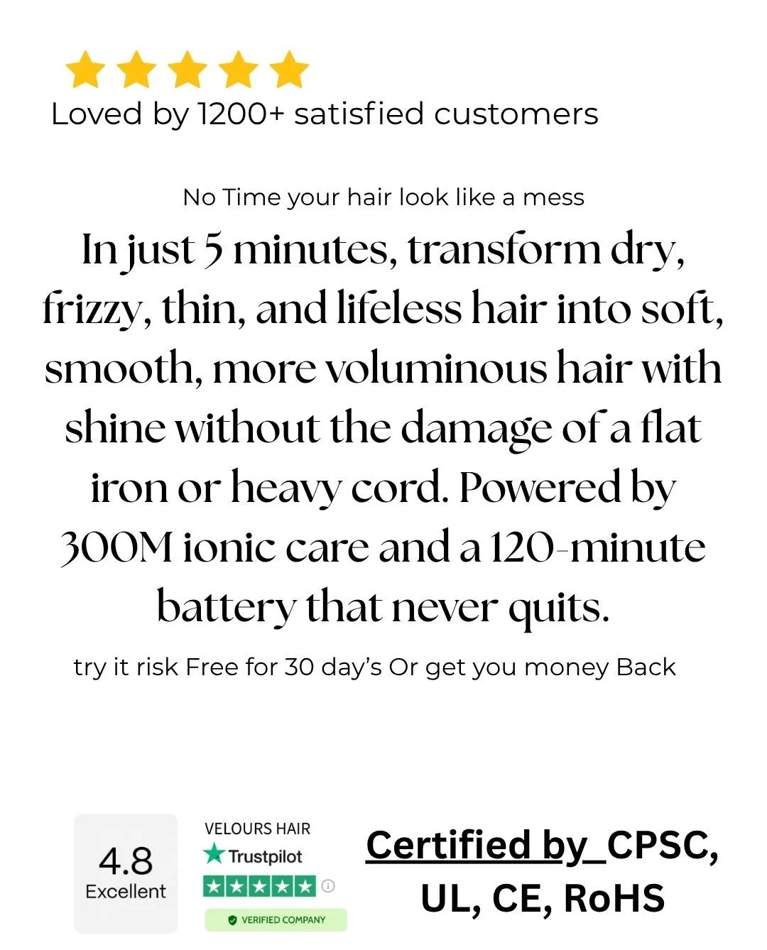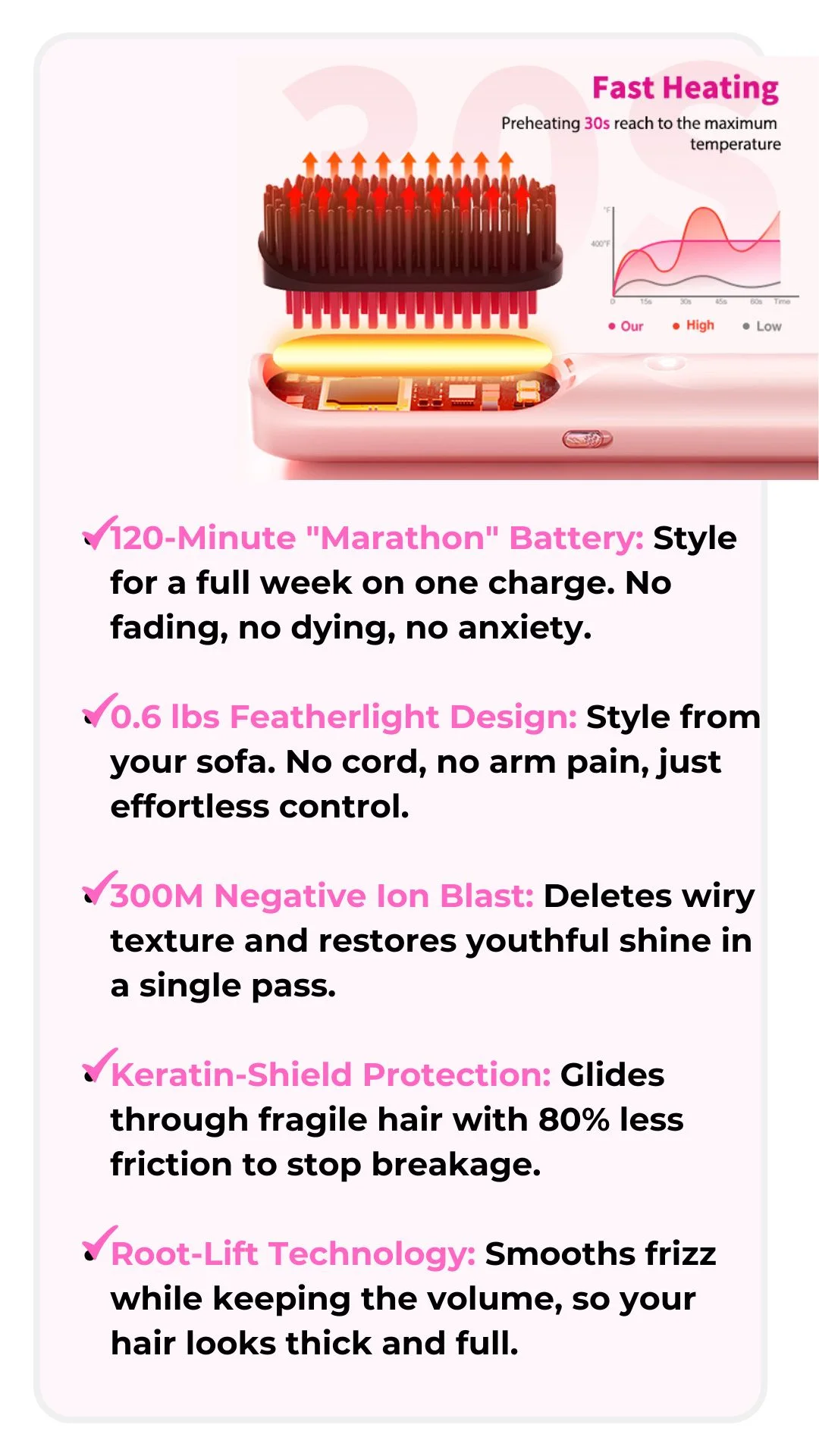 We promise you the ultimate styling freedom: a professional-grade tool that never dies mid-style, never damages your hair, and never weighs you down. With 120 minutes of power and 300M negative ions, you get a salon-perfect finish anywhere, anytime, without the cord or the compromise.
